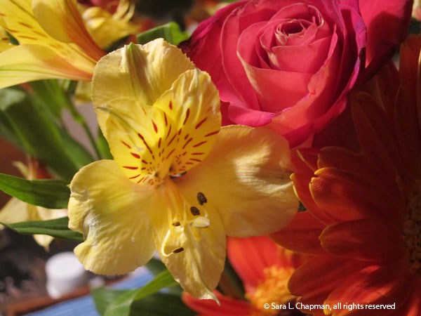That bouquet my sister brought last week yielded another photo I really like. Here is an alstroemeria blossom with its floral friends. I do like daylight best, but sometimes even incandescent light can be lovely for flowers.