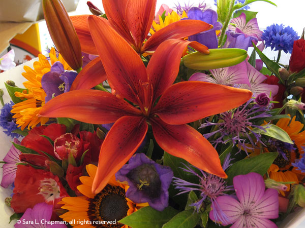 Today’s visit to the flower vendors in Seattle’s Pike Place Market was fabulous, as usual. They have lilies (and sweetpeas) in magnificent quanties, combined in surprising and unique bouquet combinations as always. This one with a lily and a happy jumble of other garden flowers beats out any supermarket bunch any day.