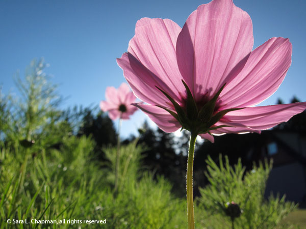 The sun is finally here. This cosmos flower is just basking in it! Another perfect day tomorrow is predicted, and then showers again. Actually, it’s amazing how quickly the flower beds dry out. Our water bill will be way higher in July than up til now, that’s for sure.