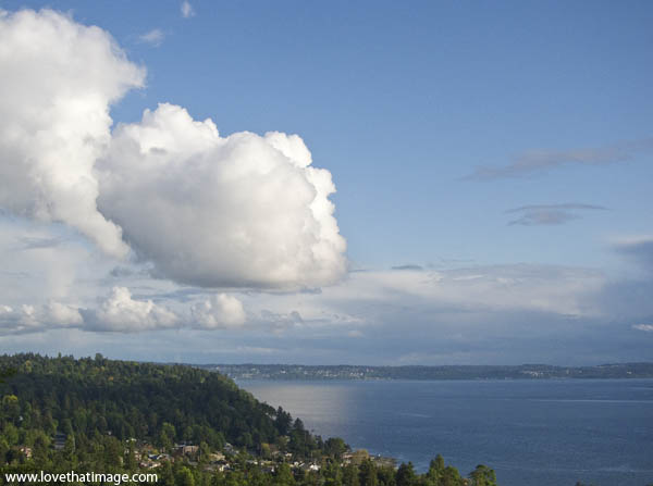 I think it’s so neat that you can see the white cloud reflected in the water. I don’t remember seeing that before, although I must have, mustn’t I? This taken just the other day at my favorite overlook over Puget Sound, looking south. Hope your day is a blue sky and puffy clouds type of day.