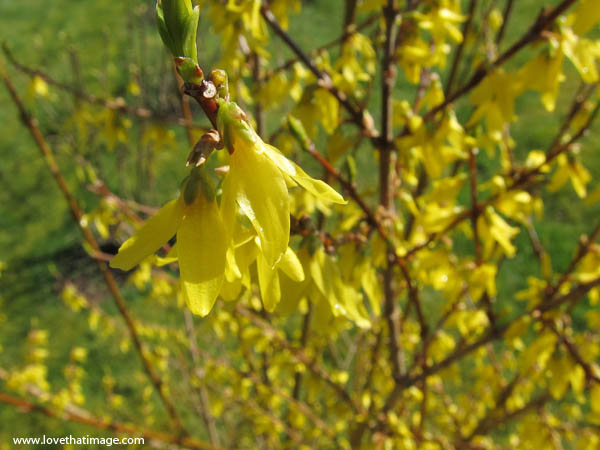 This shrub used to be seen all over, but not so much any more. Plants have fashions, and this one is passe, apparently. I grew up seeing these blooming forsythias everywhere in the earliest spring. My old house had a big one that was hardly flowering because big trees had grown up around it, shading it, but one branch touched the ground and rooted, so I took it with me. And three years later in some sun, look at it!