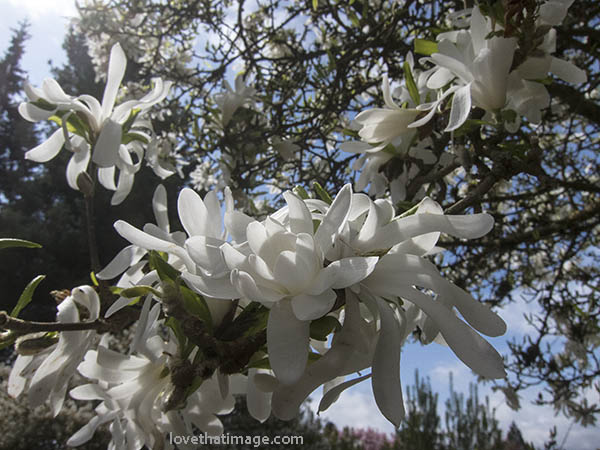 As a brief break from tulips, I thought I’d show you a new tree (to me), a star magnolia. The pretty white flowers were very fragrant, and 2 or 3 inches wide (5-8 cm). It was growing in a sweet little arboretum in Everett, WA, the Evergreen Arboretum & Gardens.