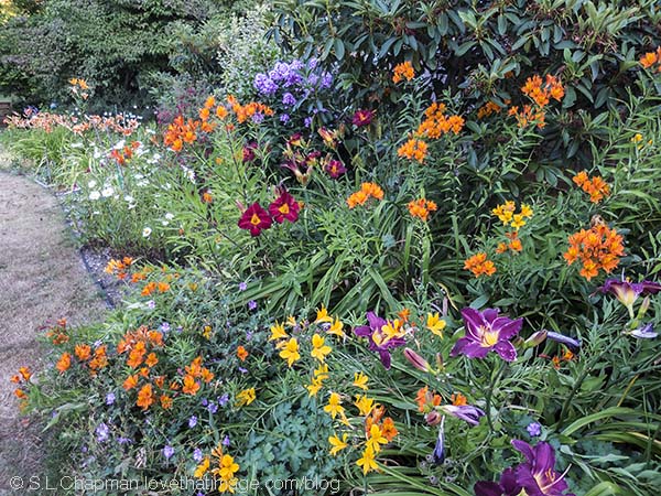 Dark red and burgundy day lilies, orange and yellow alstroemeria (Peruvian lily) bloom in my July garden