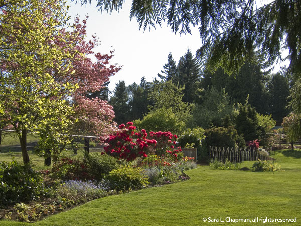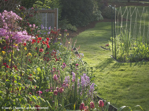 I’m posting two recent photos of my garden of the back border. The top one with the rhodies was taken earlier in the month, and the lower one was taken in mid-month (the geum is the red round flowers). They have a very different feel, don’t they? Which do you prefer?