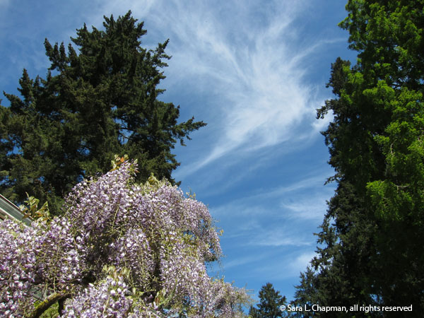 I was in a beautiful old garden down past Tacoma a week or so ago. The skies were amazing that day! My sky post for last week with the towering puffy clouds was taken that same afternoon. Cirrus clouds are some of my top faves, as they look like down wisps or cotton candy being spun, or, well, what do they look like to you?