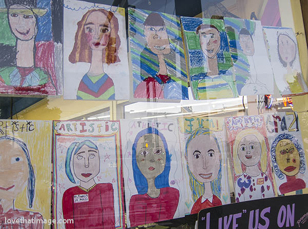 Burien, Washington is a small city west of SeaTac Airport. Once a month they do an art walk in Olde Burien. This appears to be self-portraits by some local students. I love these paintings. I hope the artists don’t mind this post!