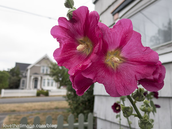 Visiting the old, hilltop neighborhood of Port Townsend, WA recently, this pretty pink hollyhock decorated the garden of the old house we were staying in.