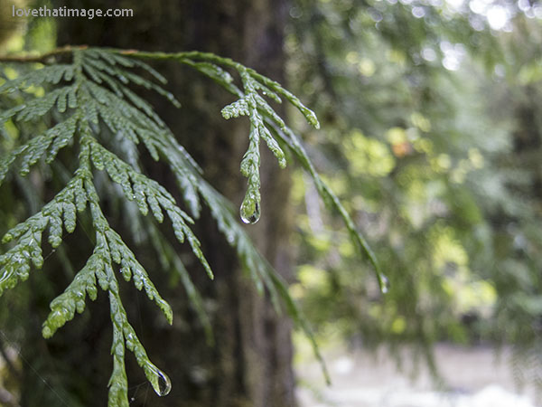 Raindrops on evergreen branch