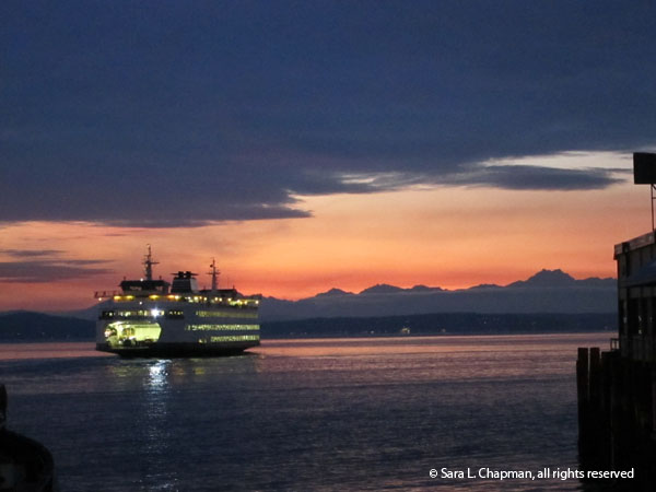 Yes, this is with the new camera, but unfortunately I did not have the right settings in place, and the quality of this image, which is straight out of the camera, is pretty poor. But isn’t it a lovely scene? There I was down near the water, with such a sunset and the ferry right there, as scenic as it gets, and fumbling around in the almost dark I just failed to get it right. Darn. Well, try to imagine it with sharp, brilliant edges, and all the water ripples showing.