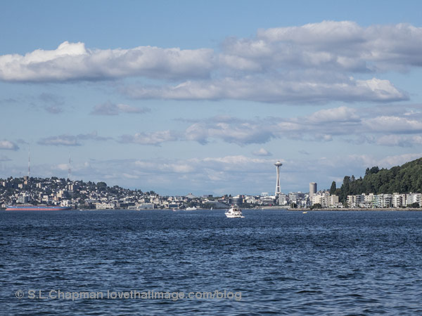 At the Alki Art Fair last weekend, the weather was magnificent. Here’s the view north showing Seattle’s iconic Space Needle.