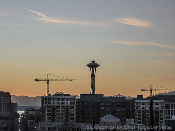 Here are only a couple of the dozens and dozens of cranes decorating the Seattle, WA skyline at dusk recently.