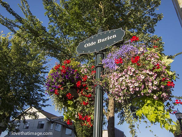 The town of Burien in Washington State, south of Seattle, has a great old downtown section. They do a wonderful flower basket decoration on the old lightpoles every year.