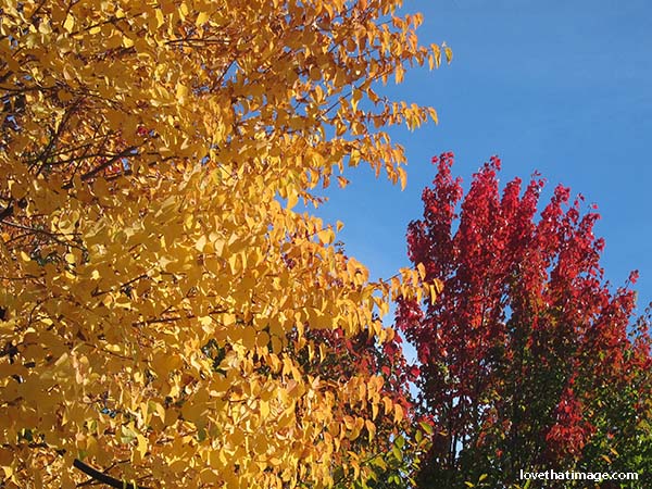We had a windstorm yesterday, so these maple leaves from a few days ago have probably blown off the old tree in my neighbor’s yard. A photo captures their incandescent color for us anyway.